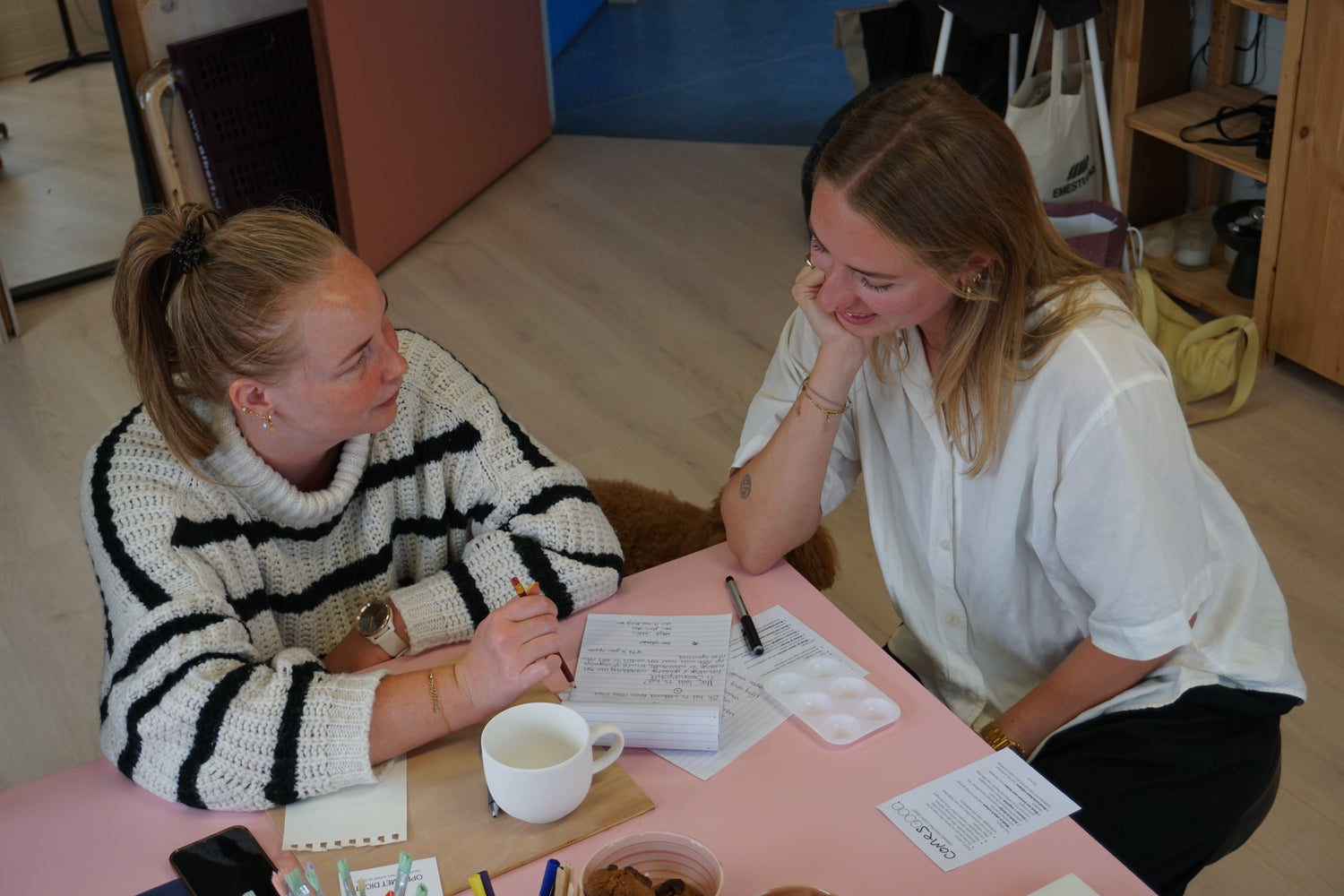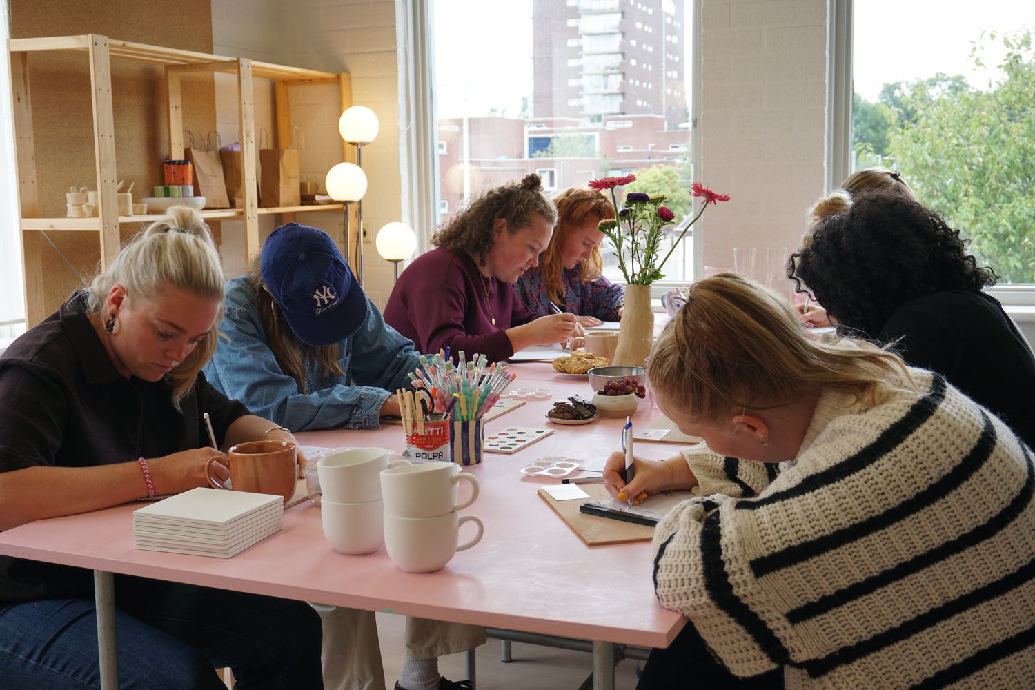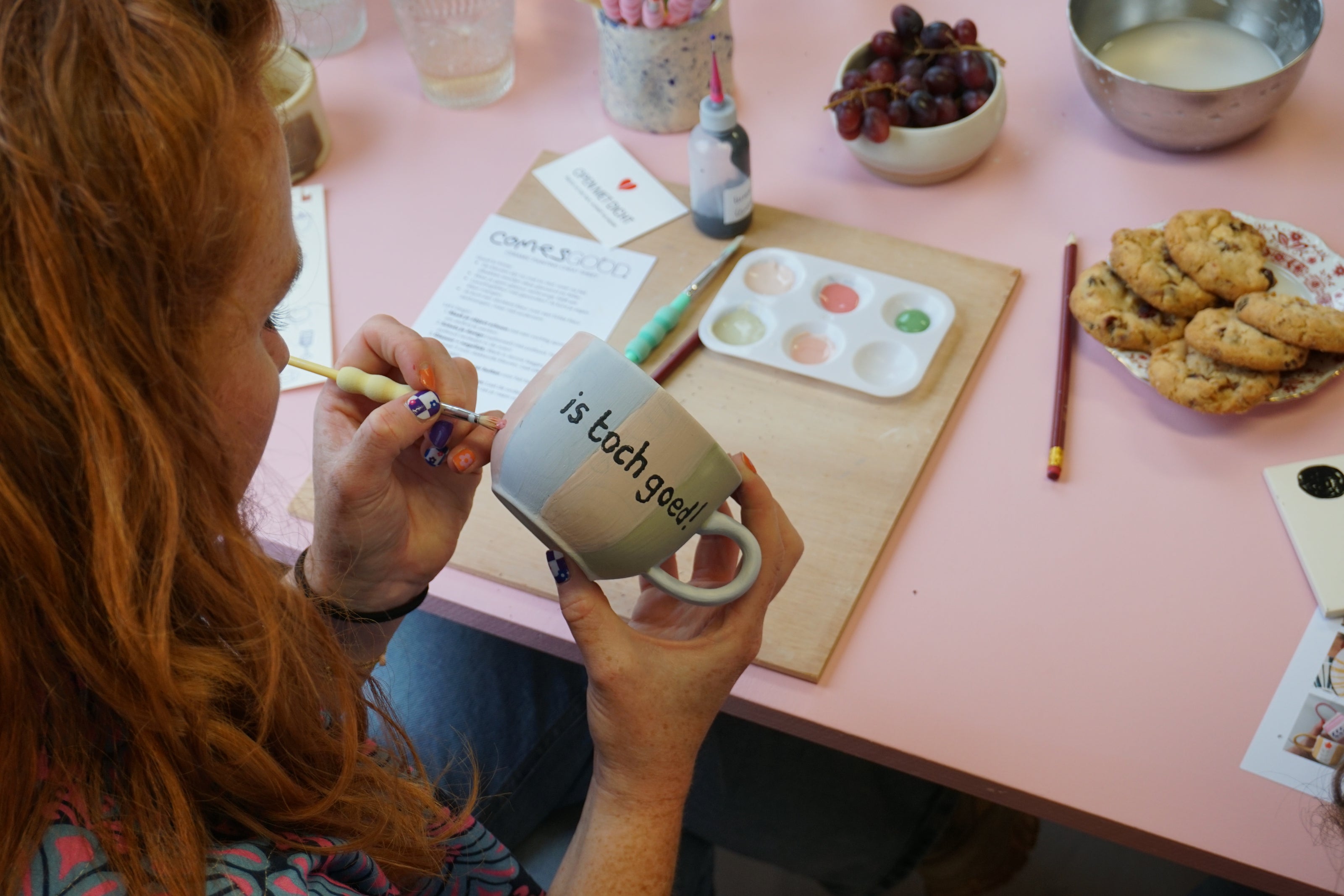 Daarna kiezen deelnemers: een keramieken tegel of een mok. Met keramiekverf beschildert iedereen zijn eigen kleurrijke creatie. Tijdens het drogen is er ruimte om na te praten, te lachen en elkaars werk te bewonderen.