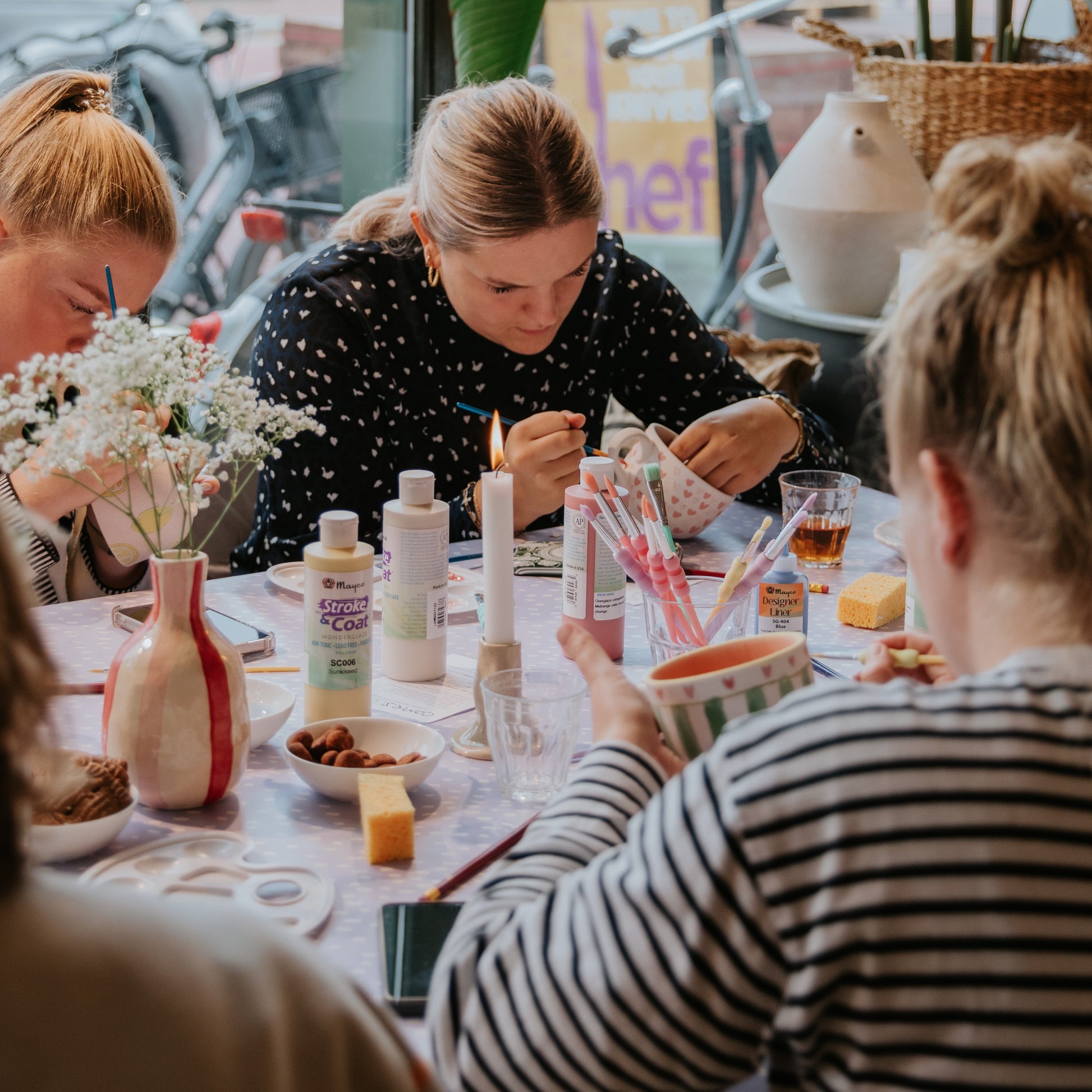 - Alle materialen die je nodig hebt: glazuren, kwasten, potloden en inspiratie